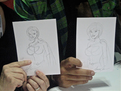 A.C. demonstrates how to draw Power Girl for MTV GEEK. (If you ask me, it was a scam so the interviewer could get a free sketch.)